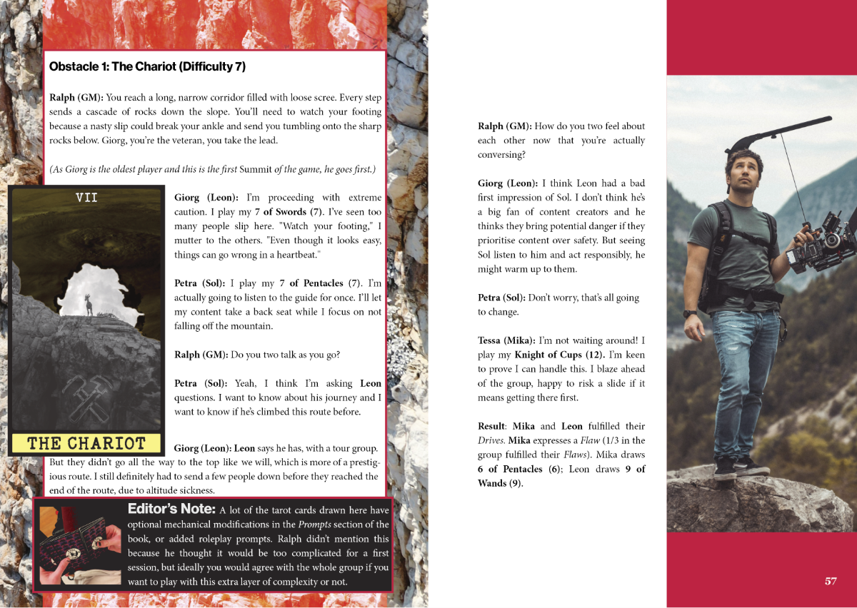 - Tarot-Driven Mechanics: A high-stakes system that uses a standard 78-card tarot deck. Minor Arcana represent your technical skills, physical resources, and luck, while Major Arcana represent the mountain.