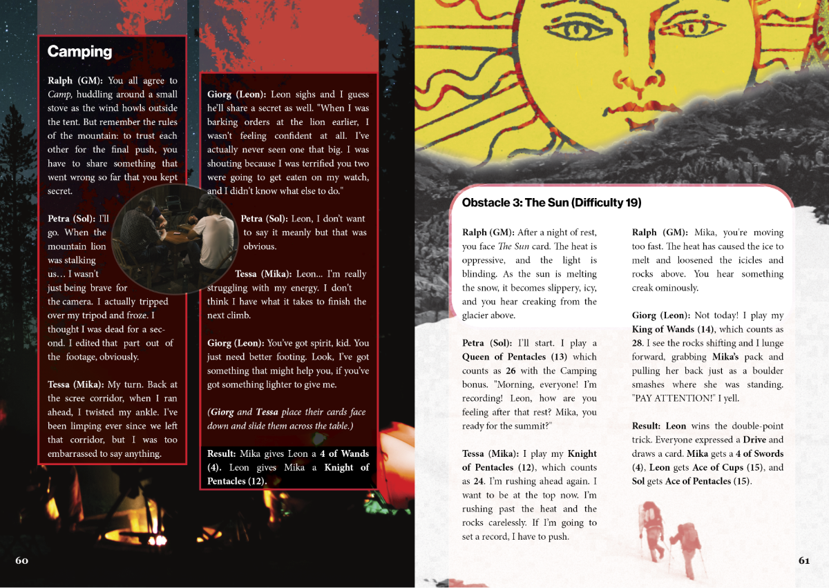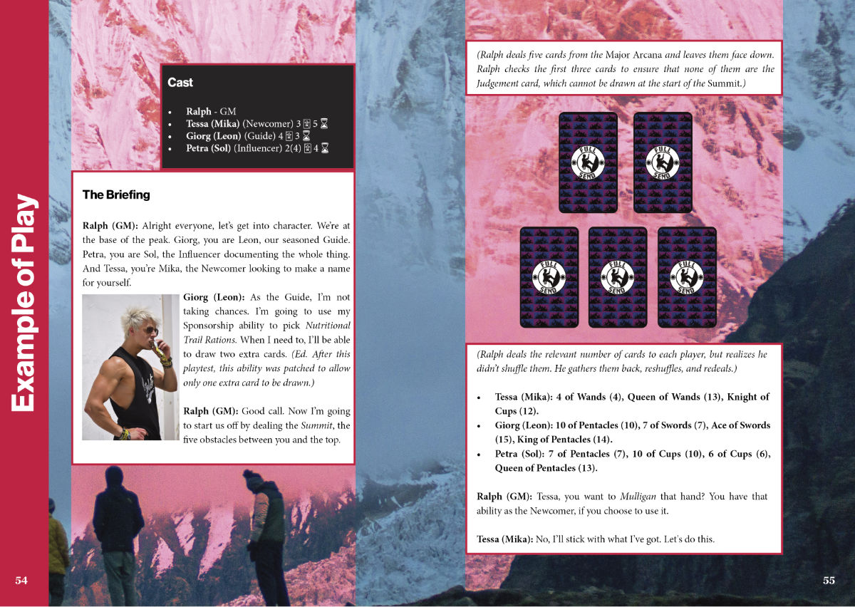 FULL SEND is a tarot-powered, trick-taking tabletop RPG about the deadly pursuit of mountaineering. In this game, a classic tarot deck becomes both your method of generating the mountain's obstacles and the means of determining your fate.